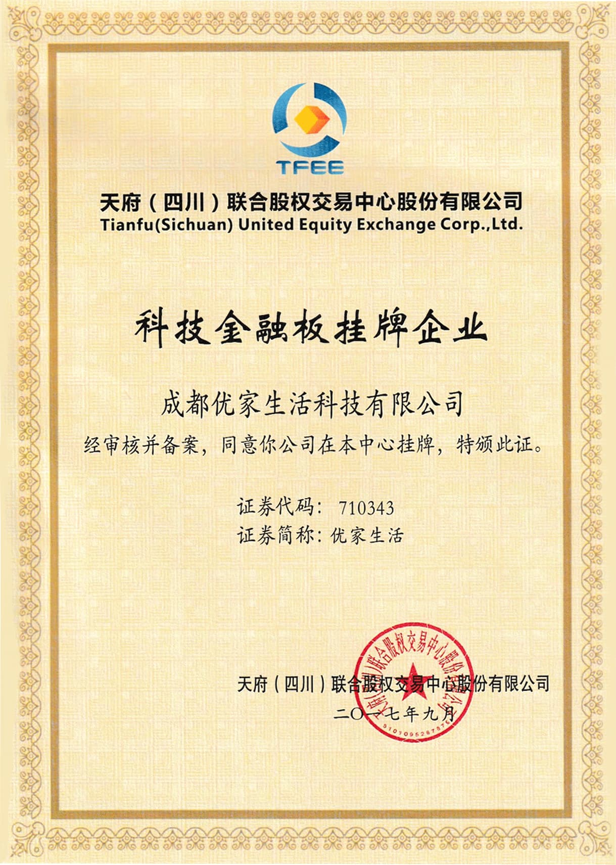 2017年9月,成都優(yōu)家生活科技有限公司在天府(四川)聯(lián)合股權交易中心科技金融板掛牌。