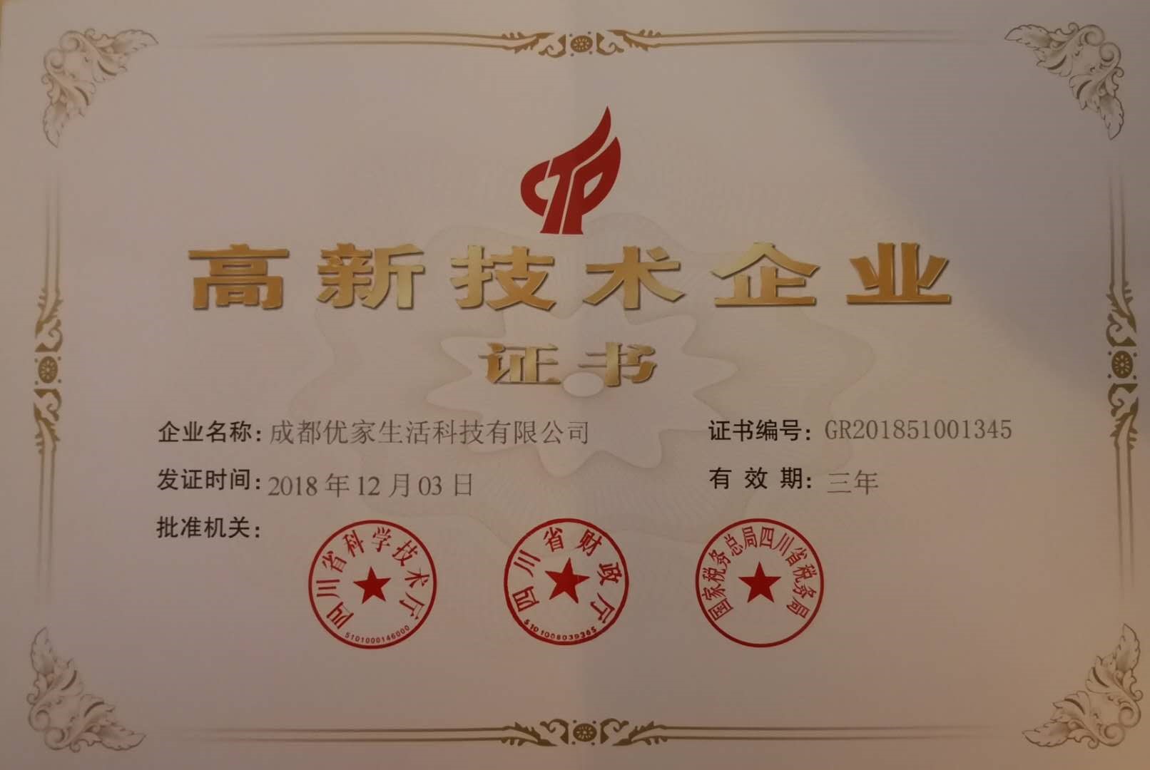 2018年12月,成都優(yōu)家生活科技有限公司通過國家高新技術企業(yè)認證,成為國家高新技術企業(yè)。