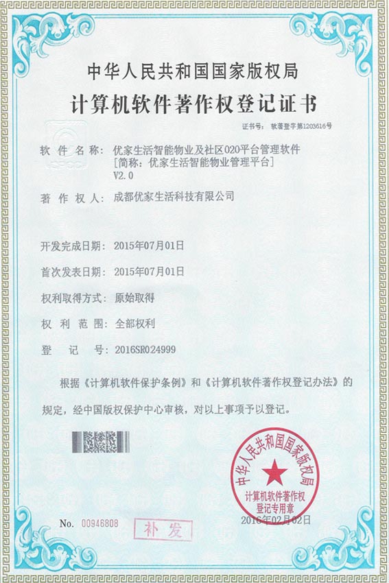 公司獲得新的軟件著作權(quán)——優(yōu)家生活智能物業(yè)及社區(qū)O2O平臺(tái)管理軟件V2.0
