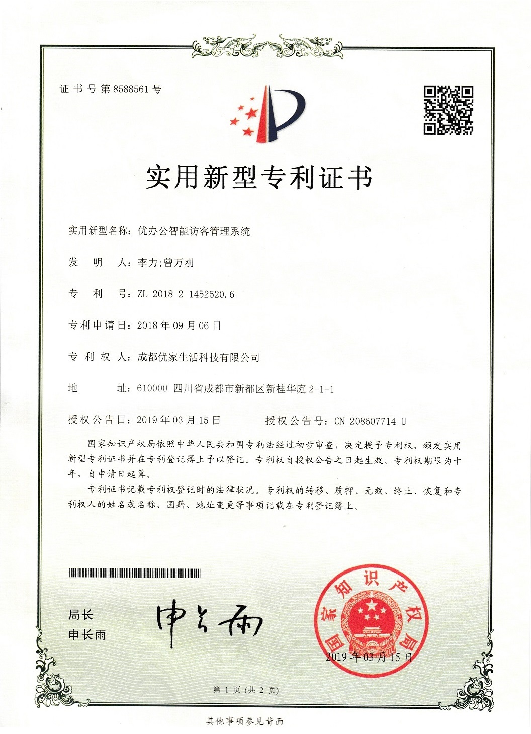 公司產(chǎn)品“優(yōu)辦公智能訪客管理系統(tǒng)”獲得實(shí)用新型專利